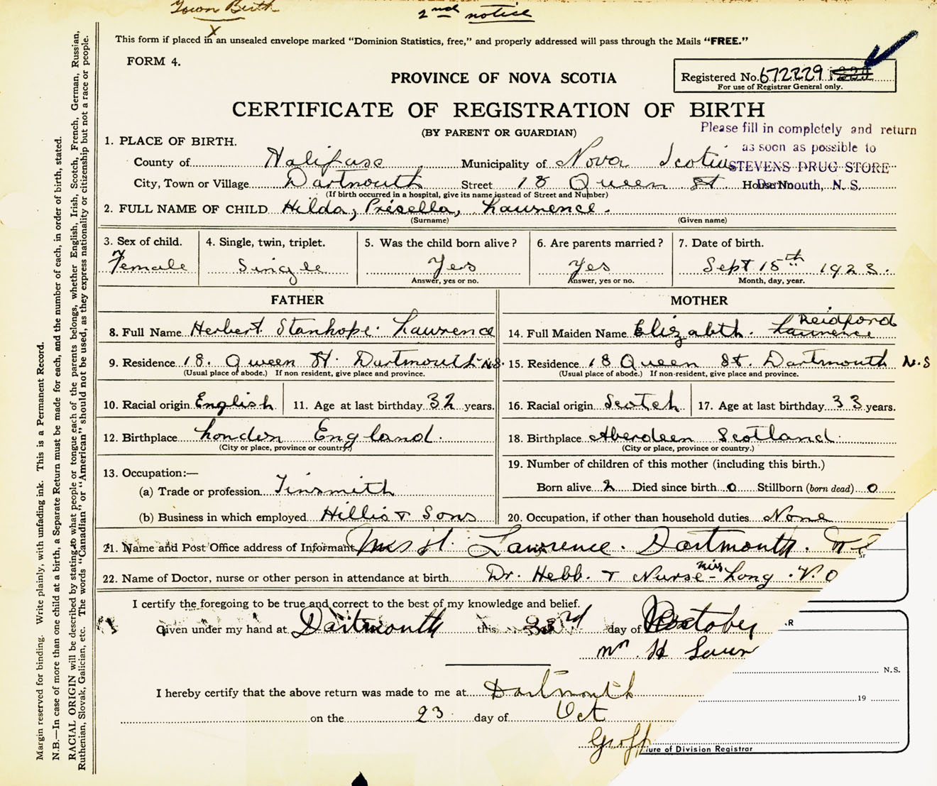Female Birth Registration: Year: 1923 number: 67200229