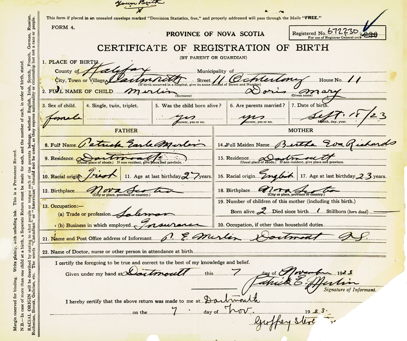 Female Birth Registration: Year: 1923 number: 67200230