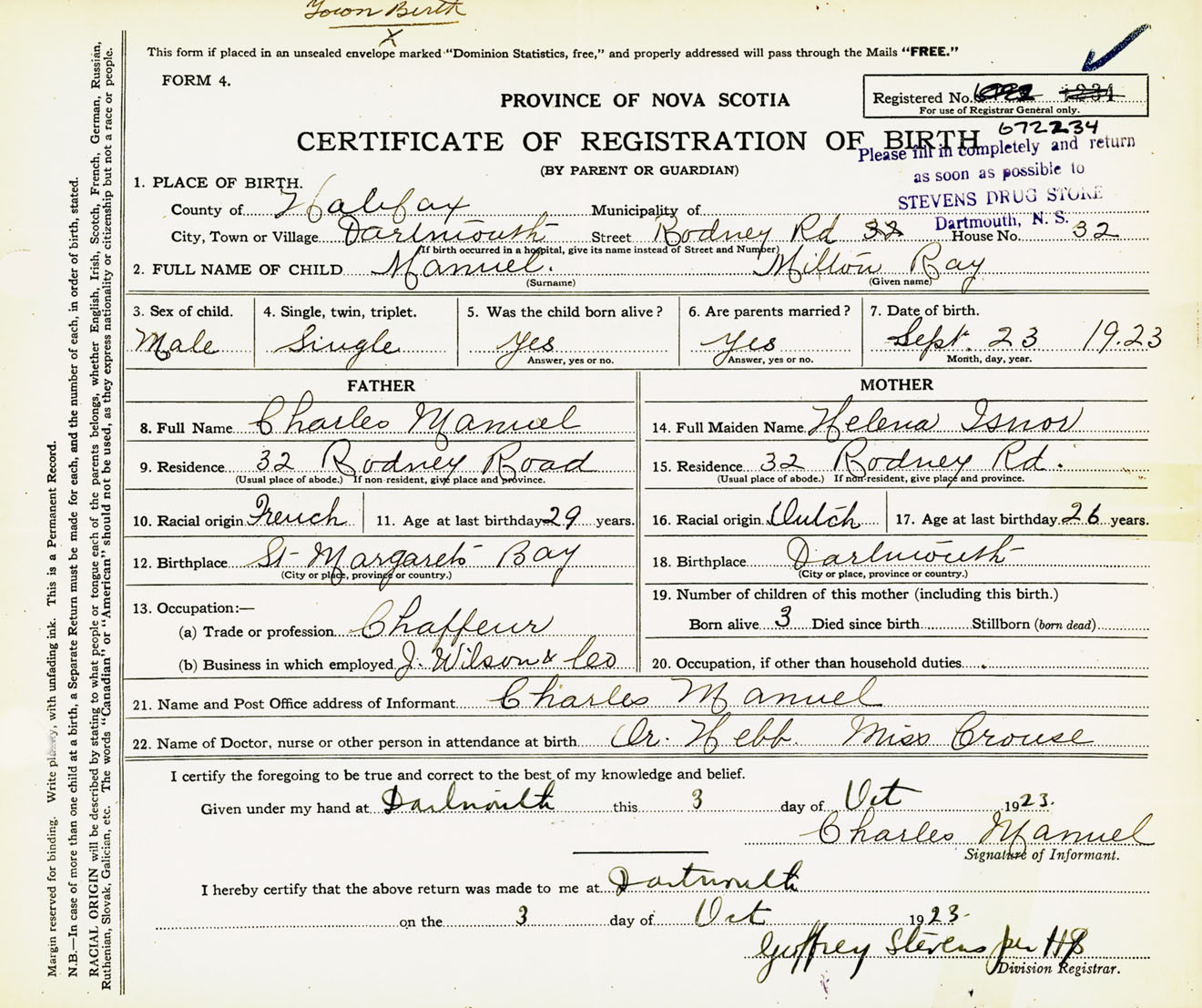 Male Birth Registration: Year: 1923 number: 67200234