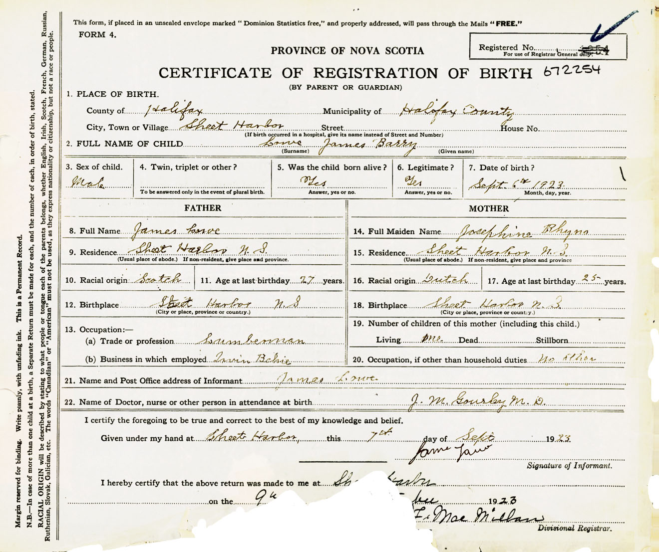 Male Birth Registration: Year: 1923 number: 67200254