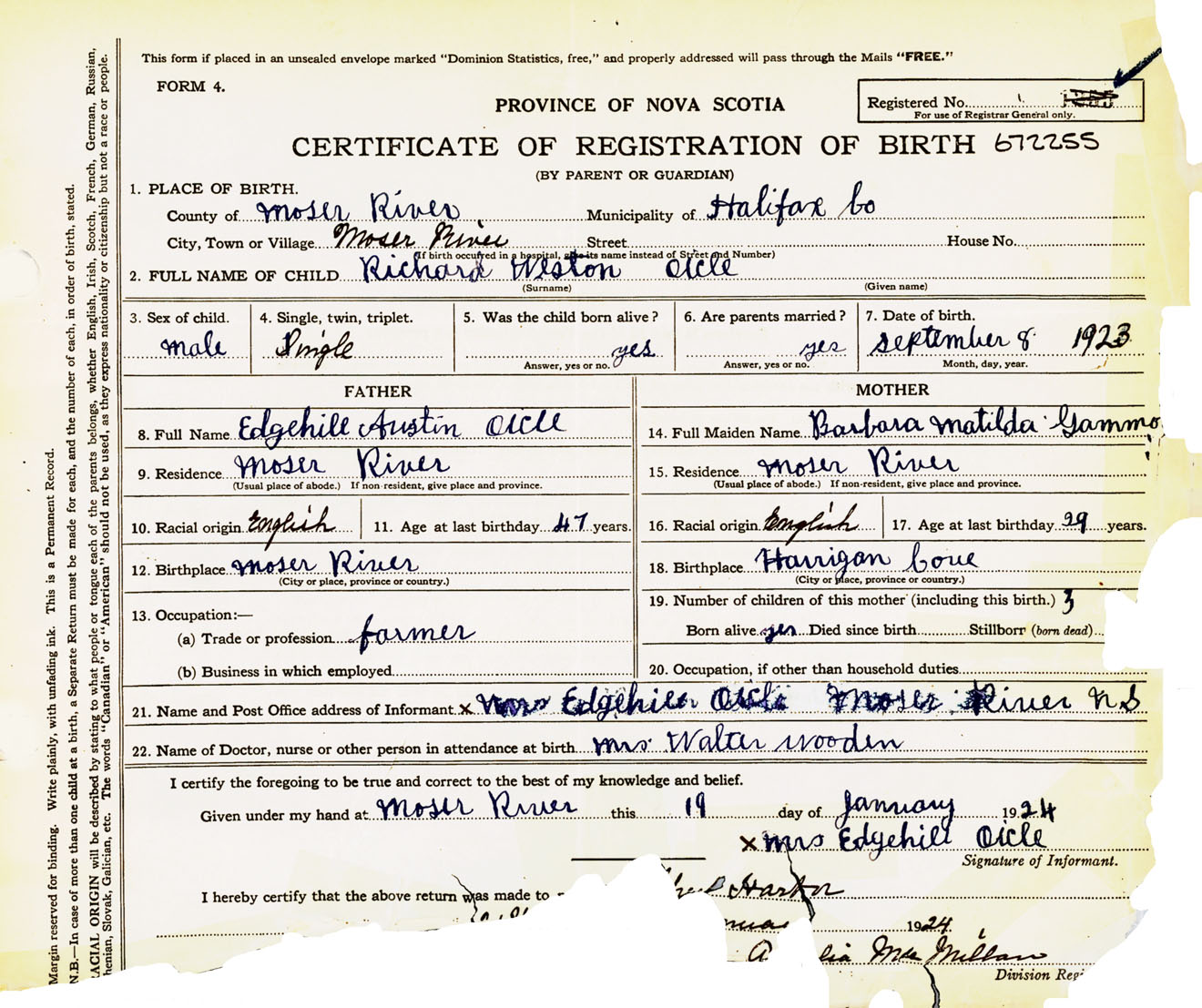 Male Birth Registration: Year: 1923 number: 67200255