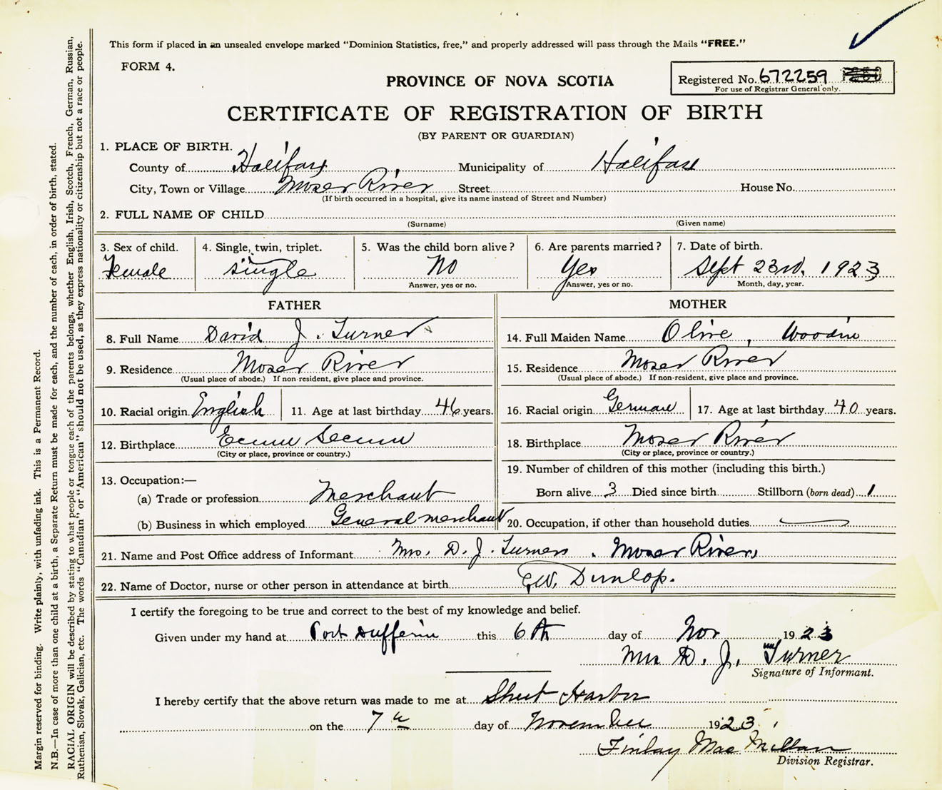 Female Birth Registration: Year: 1923 number: 67200259