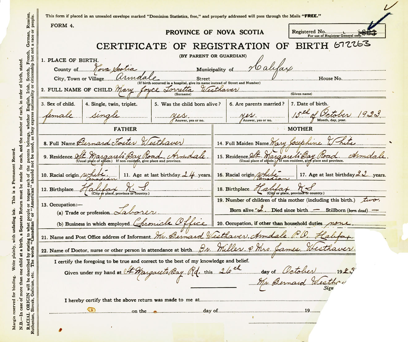 Female Birth Registration: Year: 1923 number: 67200263
