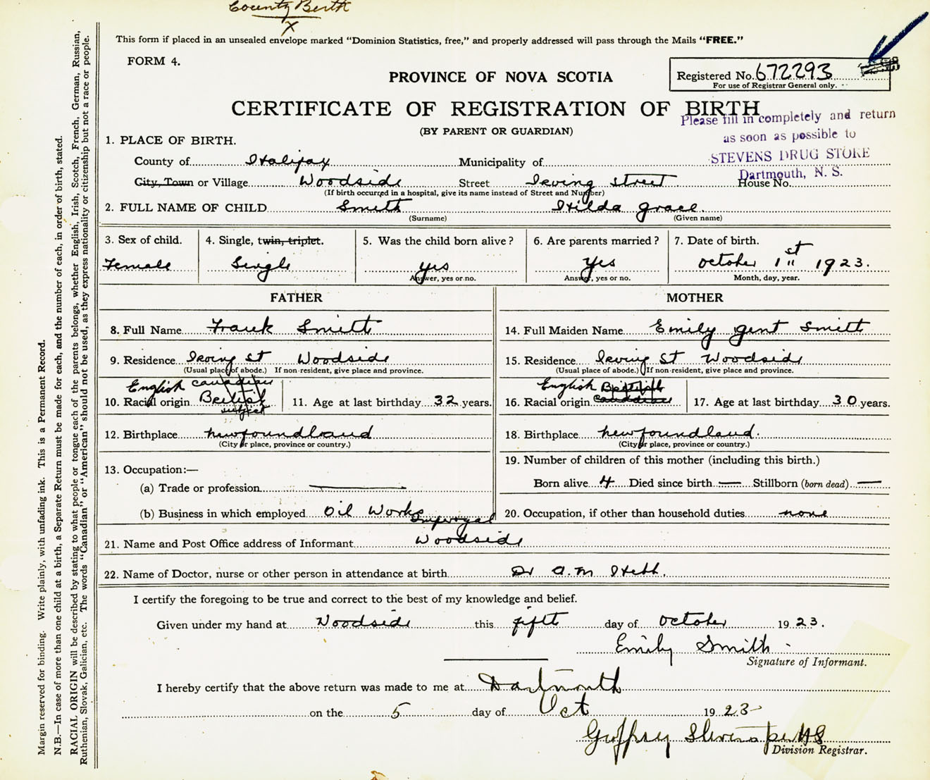 Female Birth Registration: Year: 1923 number: 67200293