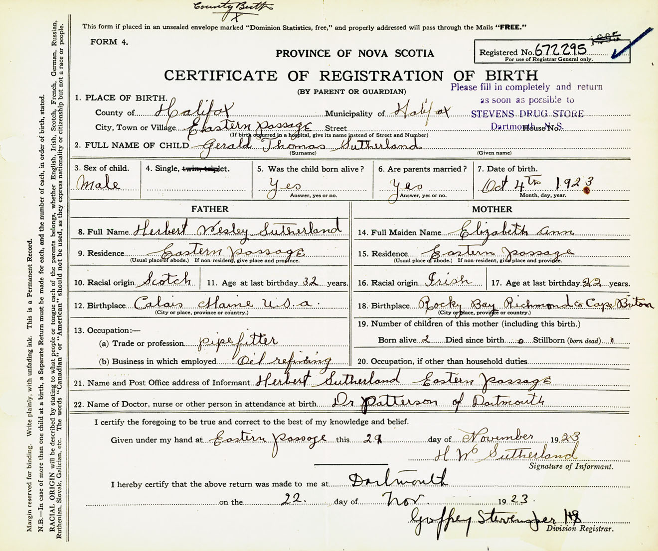 Male Birth Registration: Year: 1923 number: 67200295