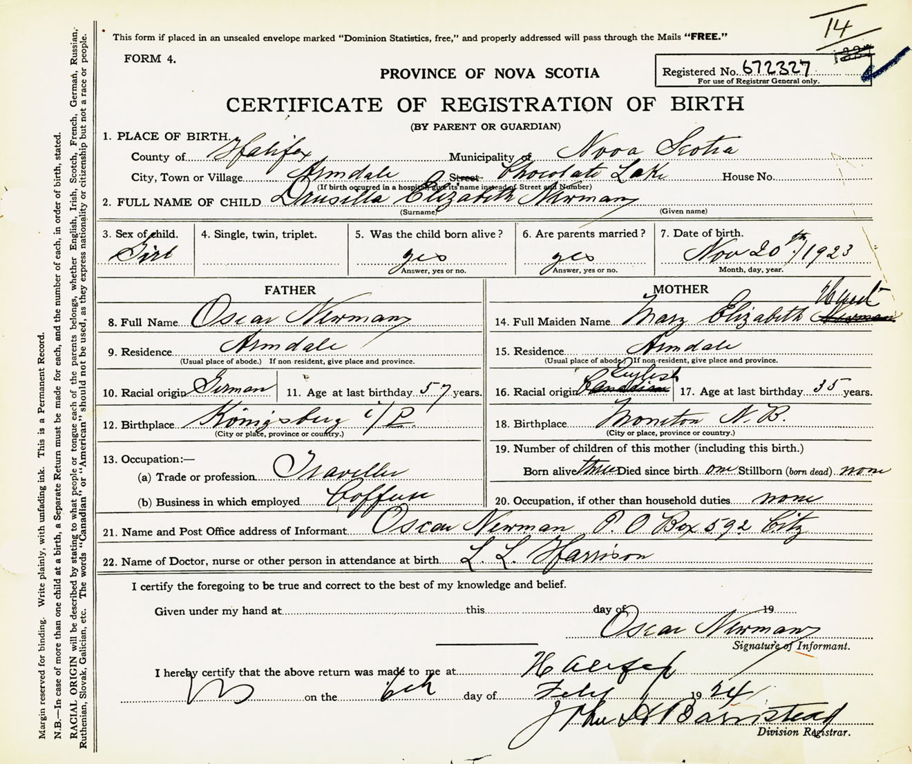 Female Birth Registration: Year: 1923 number: 67200327