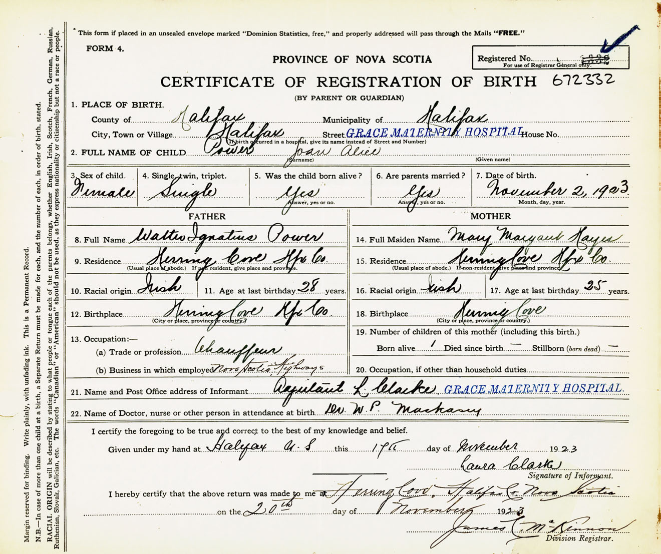 Female Birth Registration: Year: 1923 number: 67200332