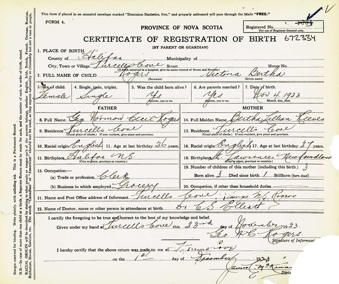 Female Birth Registration: Year: 1923 number: 67200334