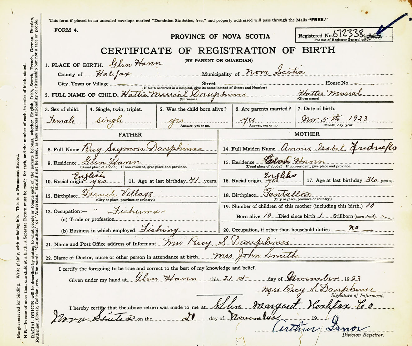 Female Birth Registration: Year: 1923 number: 67200338