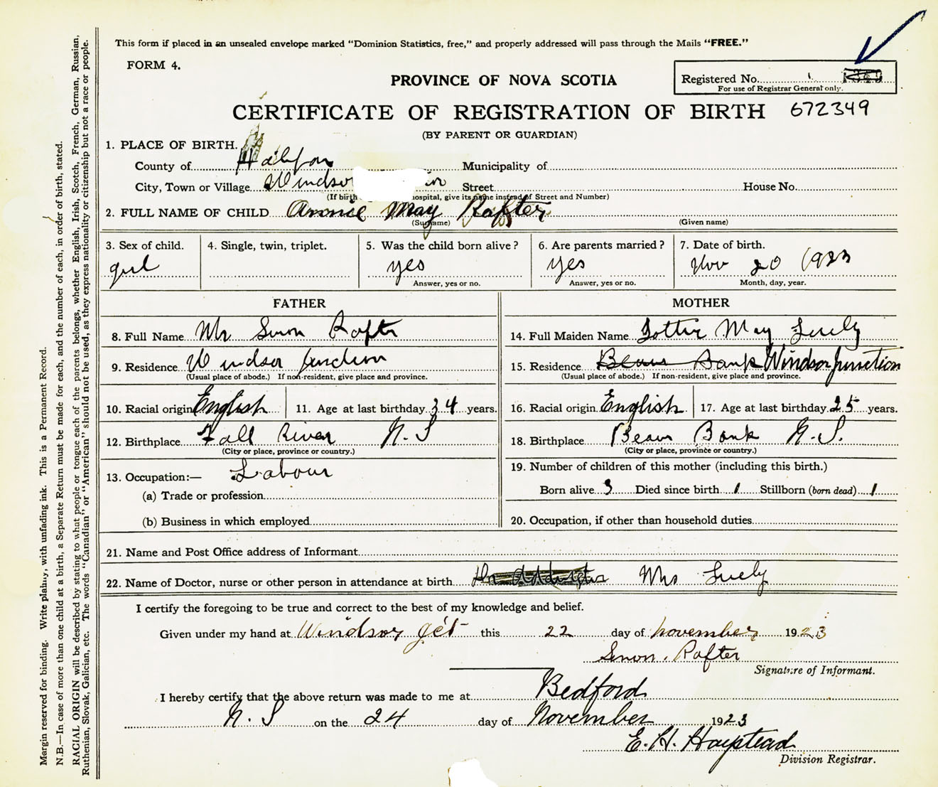 Female Birth Registration: Year: 1923 number: 67200349