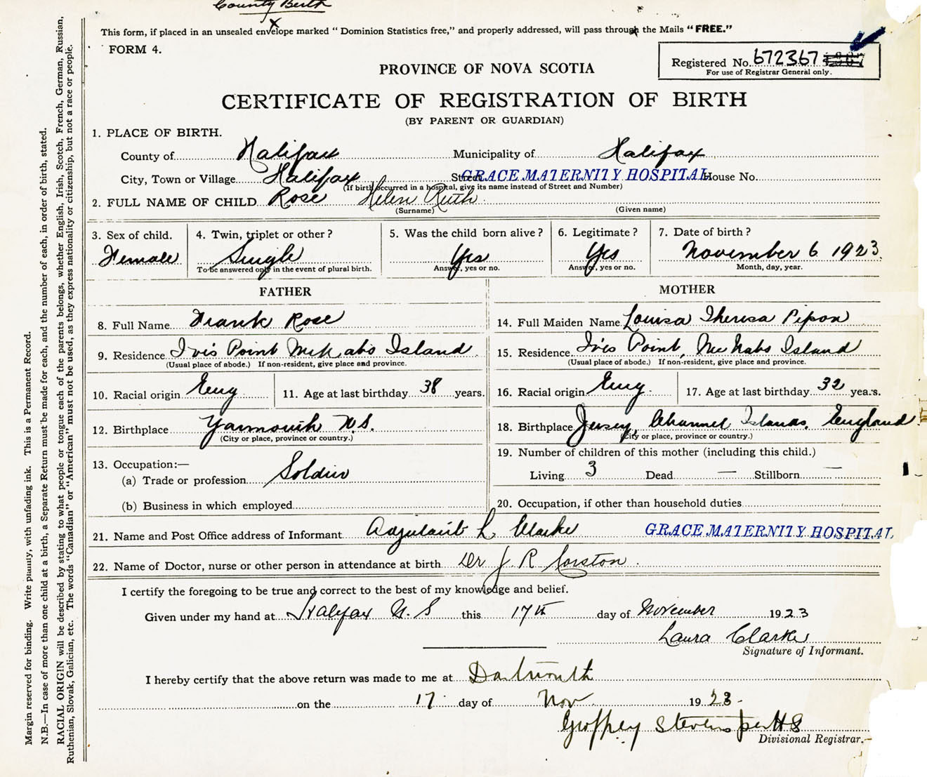 Female Birth Registration: Year: 1923 number: 67200367