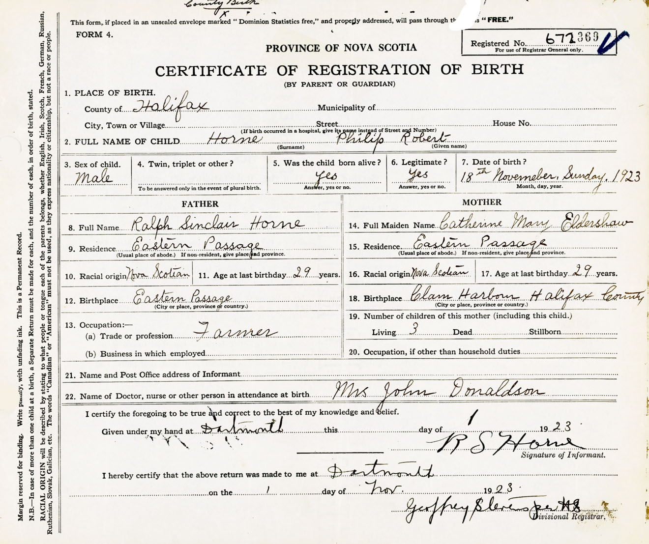 Male Birth Registration: Year: 1923 number: 67200369
