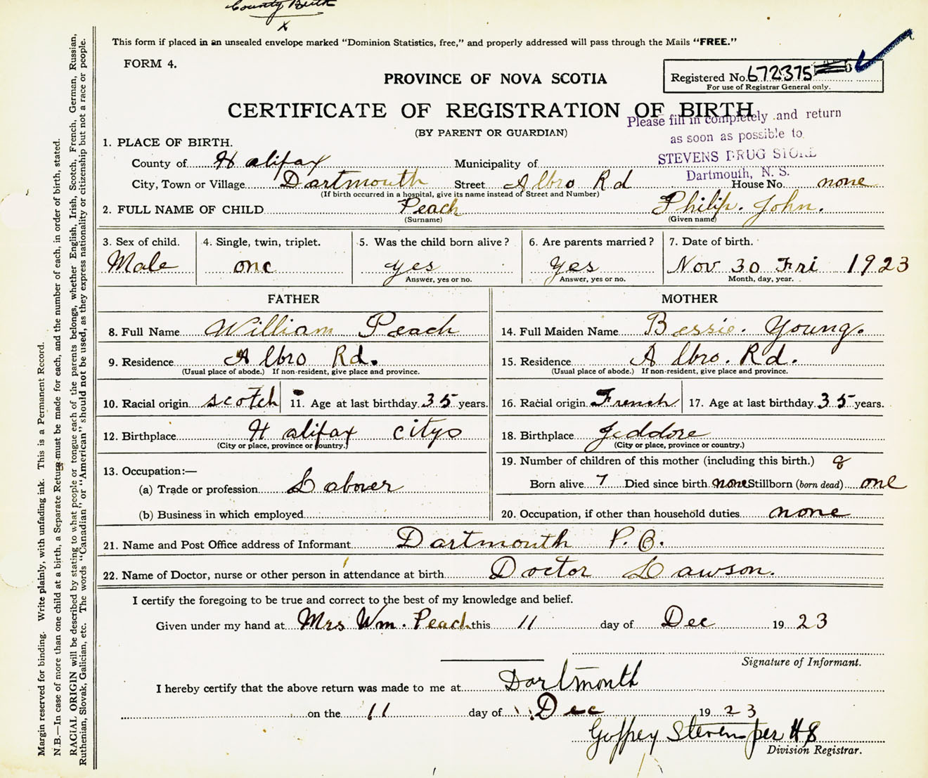 Male Birth Registration: Year: 1923 number: 67200375