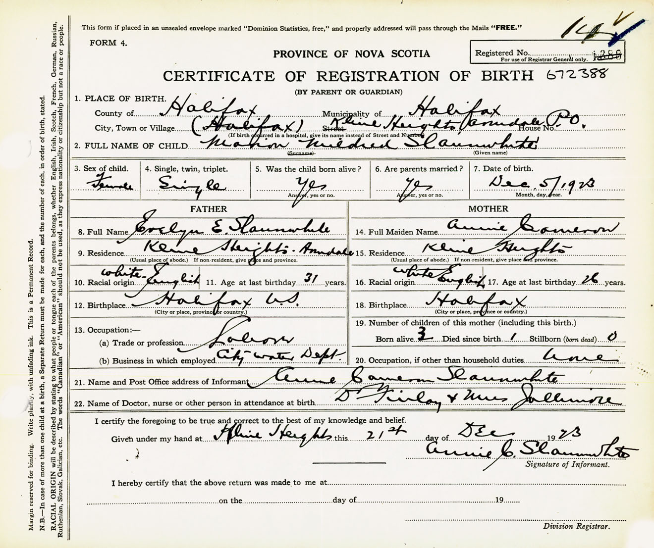 Female Birth Registration: Year: 1923 number: 67200388