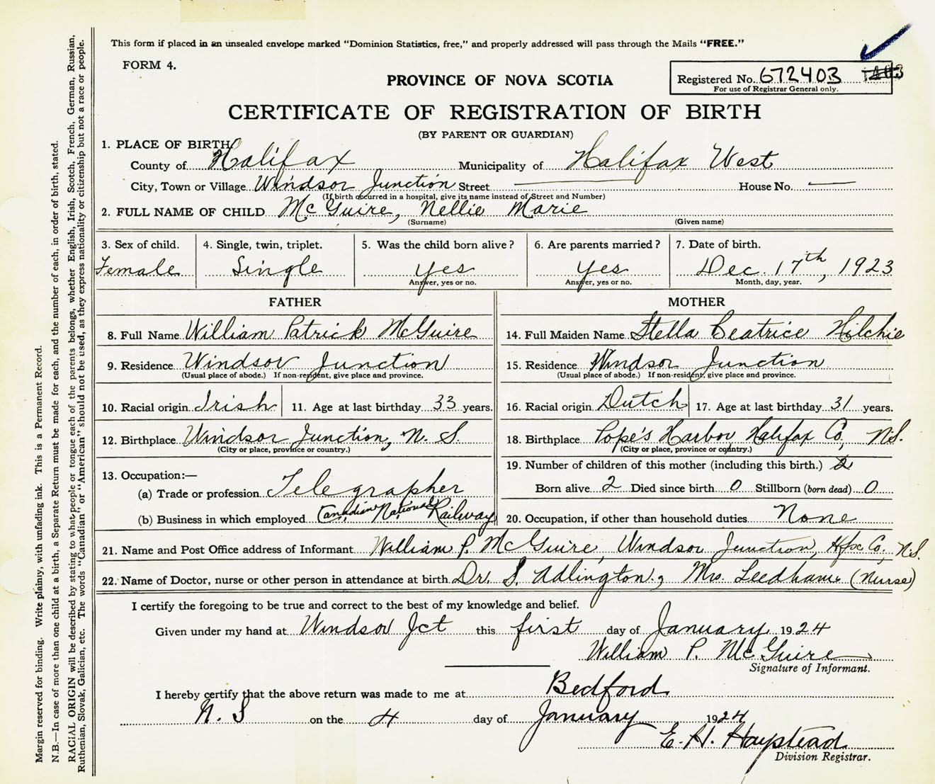 Female Birth Registration: Year: 1923 number: 67200403