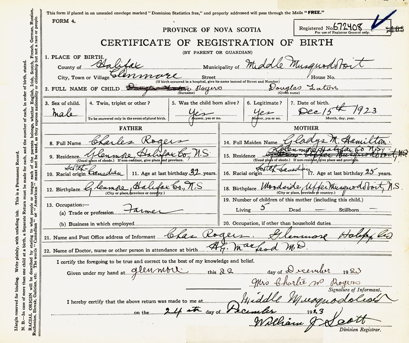 Male Birth Registration: Year: 1923 number: 67200408