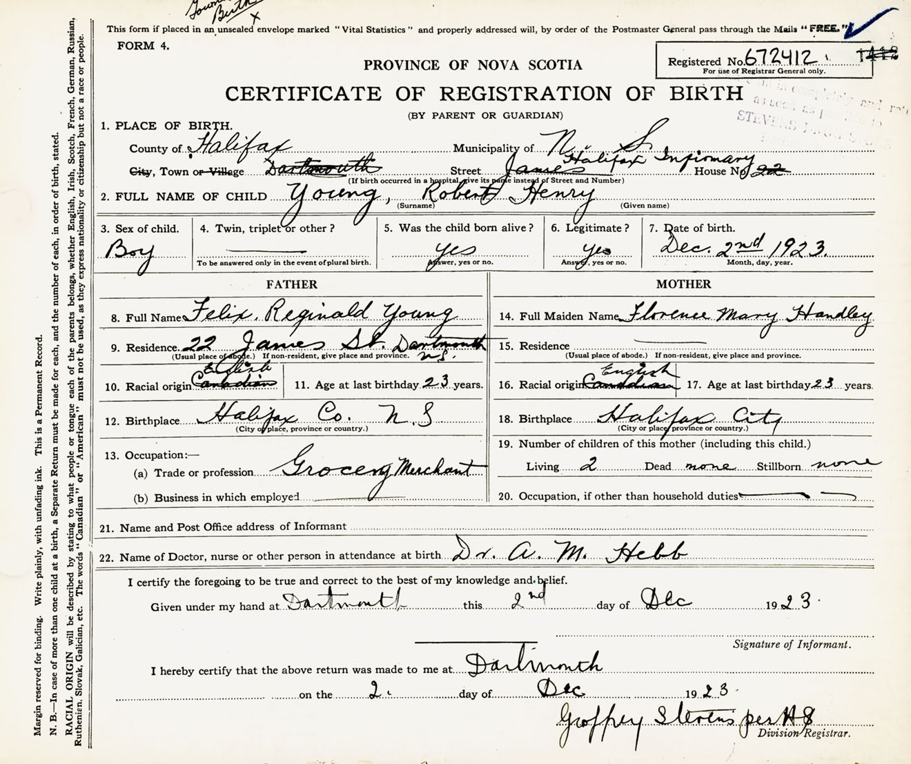 Male Birth Registration: Year: 1923 number: 67200412
