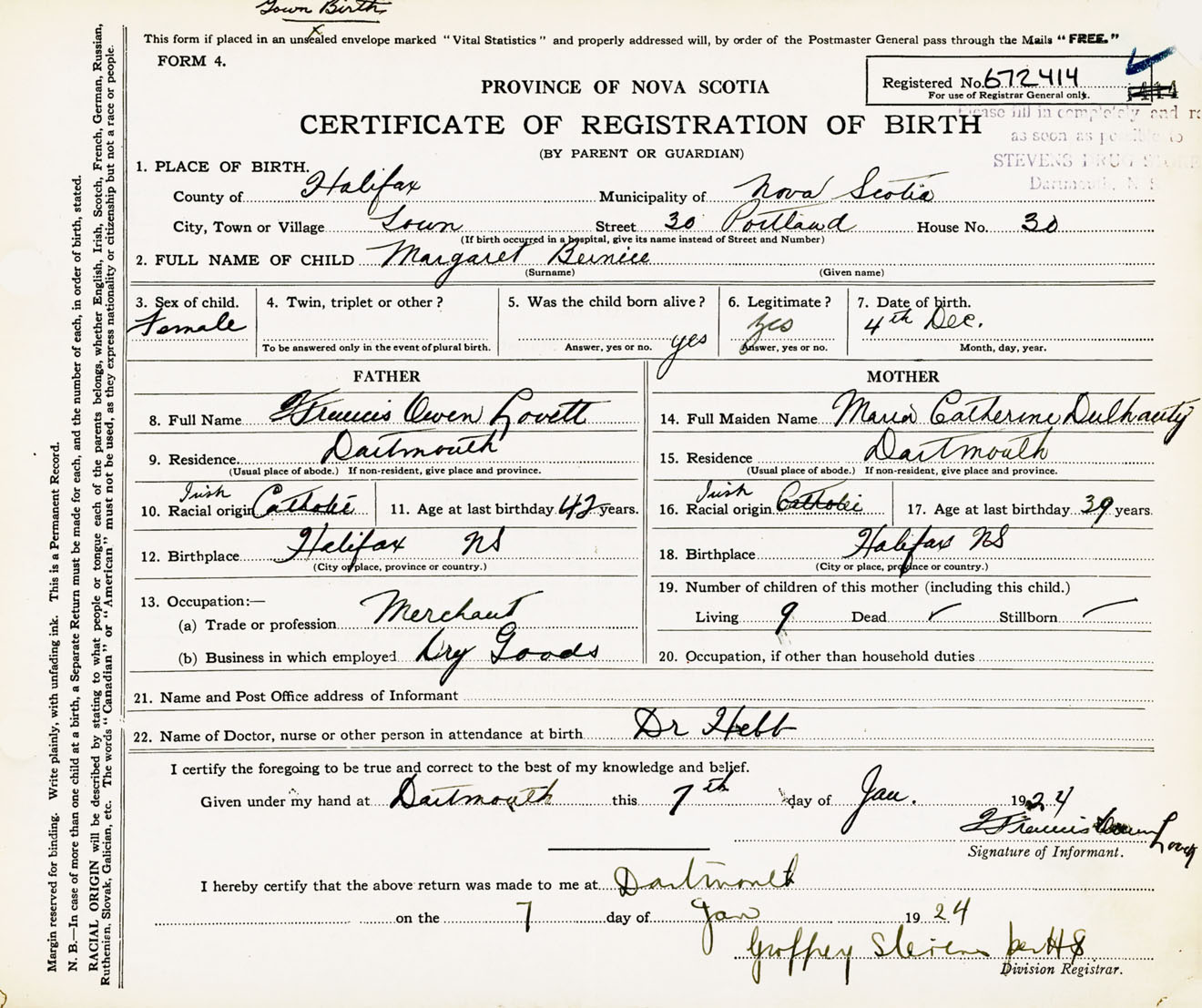 Female Birth Registration: Year: 1923 number: 67200414