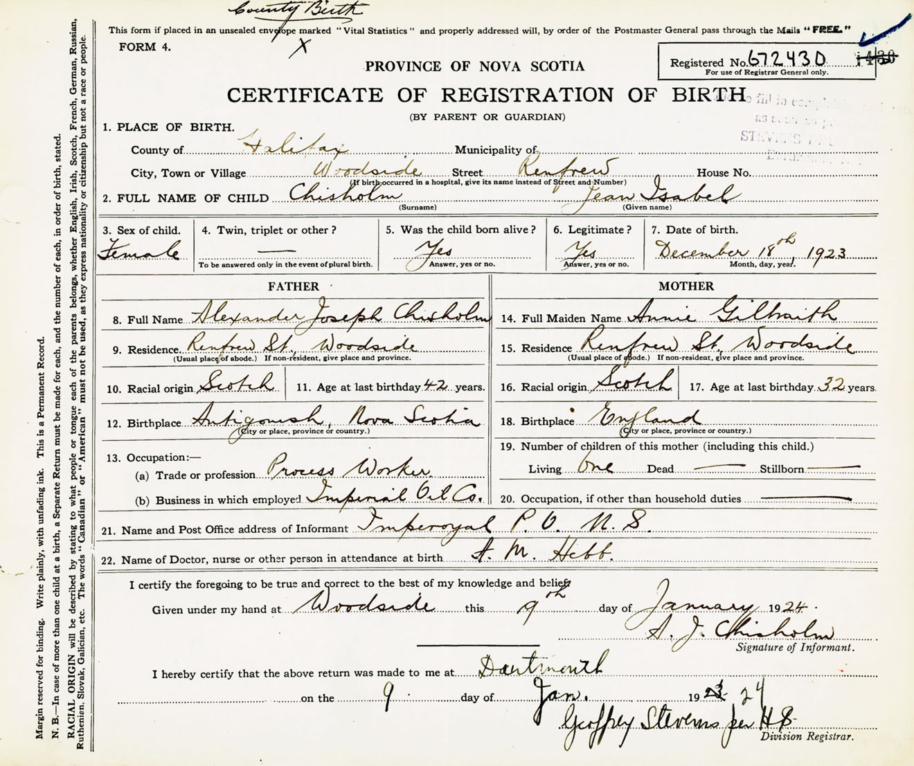 Female Birth Registration: Year: 1923 number: 67200430
