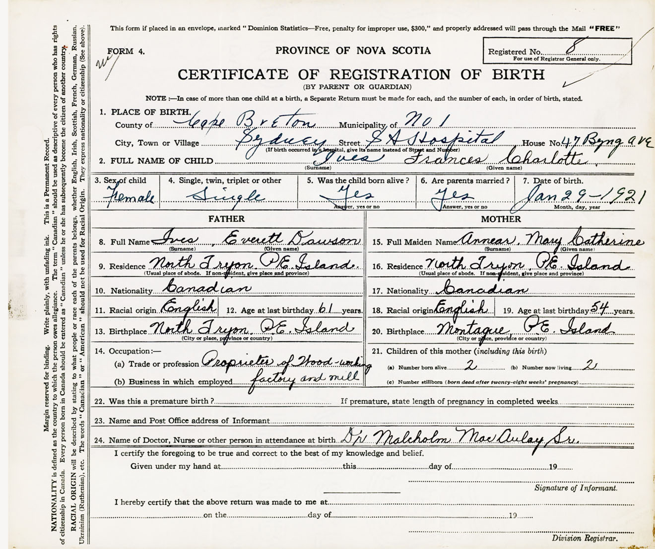 22. Name of Doctor, nurse or other person in attendance at birth Dr. Malcolm MacAulay, Sr.