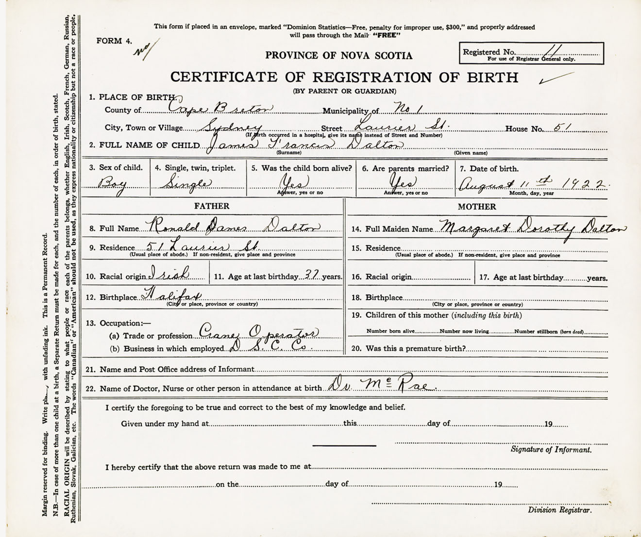 22. Name of Doctor, nurse or other person in attendance at birth Dr. McRae