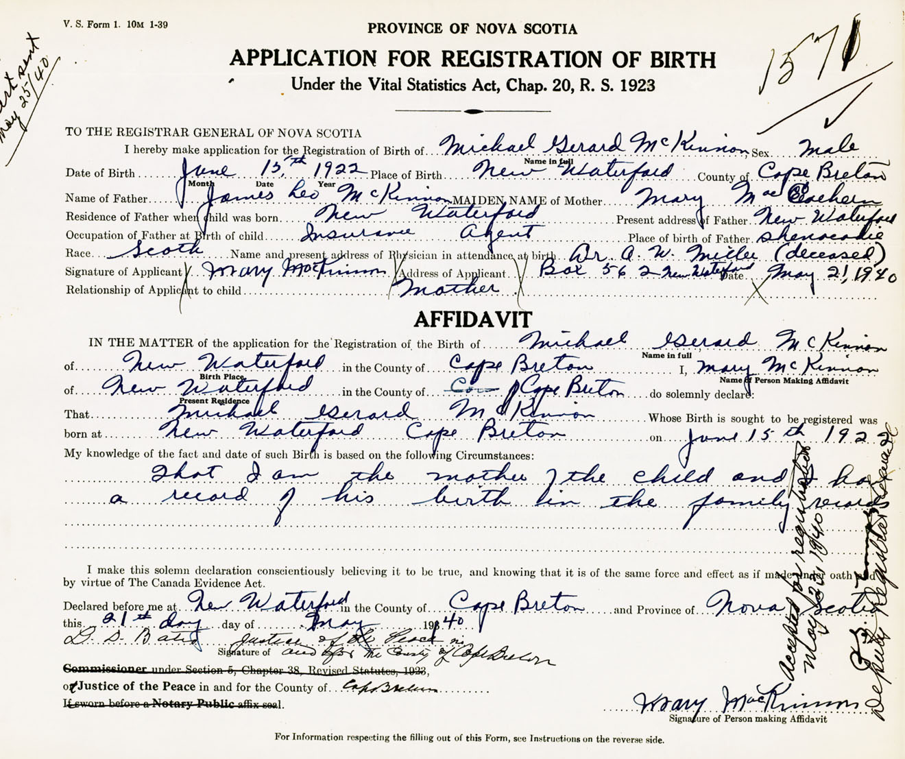 Name of Father James Leo McKinnon MAIDEN NAME of Mother Mary MacEachern