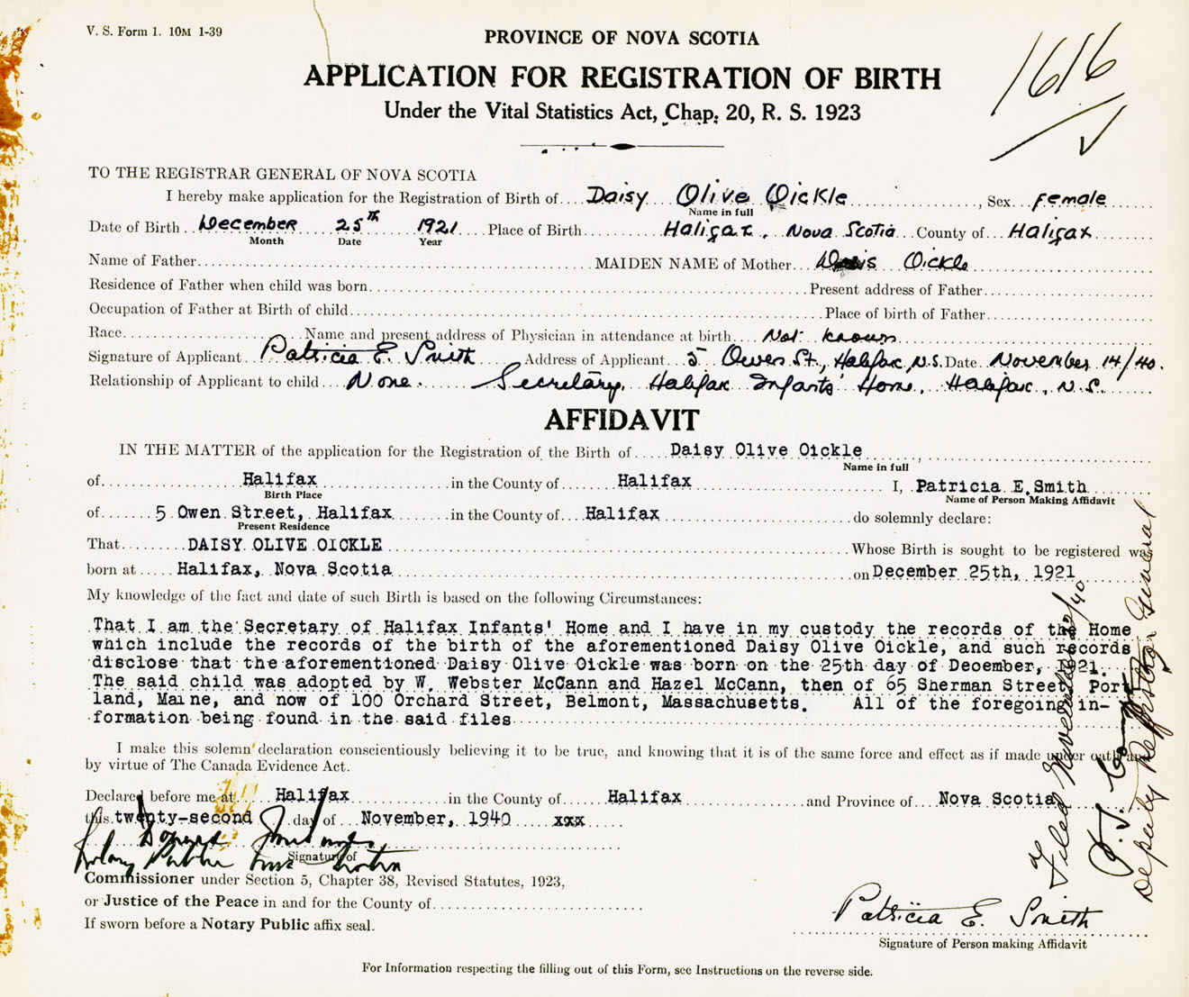 That I am the Secretary of Halifax Infants' Home and I have in my custody the records of the Home which include the records of the birth of the aforementioned Daisy Olive Oickle, and such records disclose that the aforementioned Daisy Olive Oickle was born on the 25th day of December 1921. The said child was adopted by W. Webster McCann and Hazel McCann, then of 65 Sherman Street, Portland Maine, and now of 100 Orchard Street, Belmont, Massachusetts. All of the foregoing information being found in the said files.
