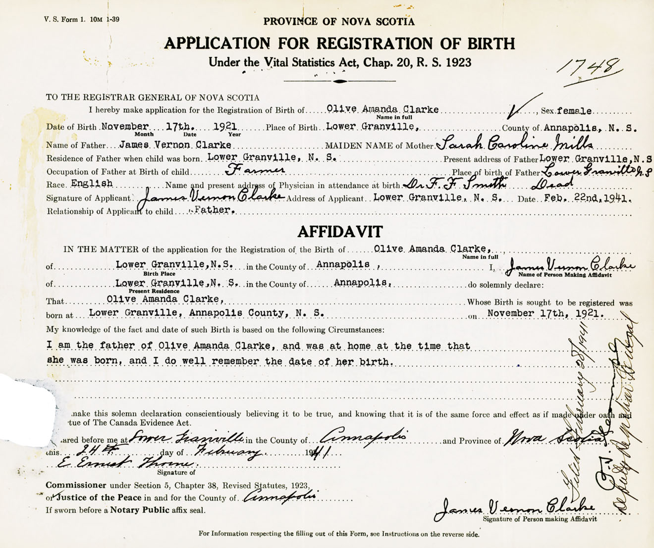 Signature of Applicant James Vernon Clarke Address of Applicant Lower Granville Date February 22, 1941