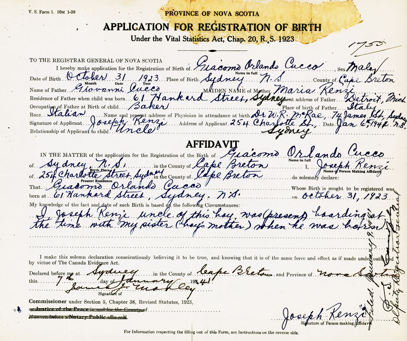 Signature of Applicant Joseph Renzi Address of Applicant 254 Charlotte St. Sydney Date January 6, 1941