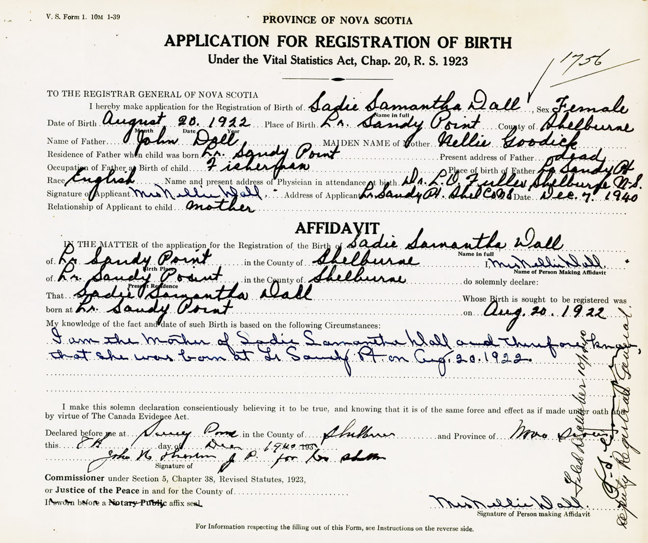 I am the Mother of Sadie Samantha Dall and therefore know that she was born at Lower Sandy Point on August 20, 1922