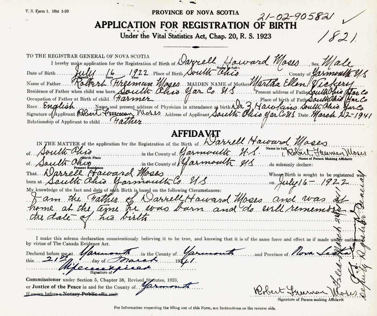 Signature of Applicant Robert Freeman Moses Address of Applicant South Ohio Date March 22, 1941