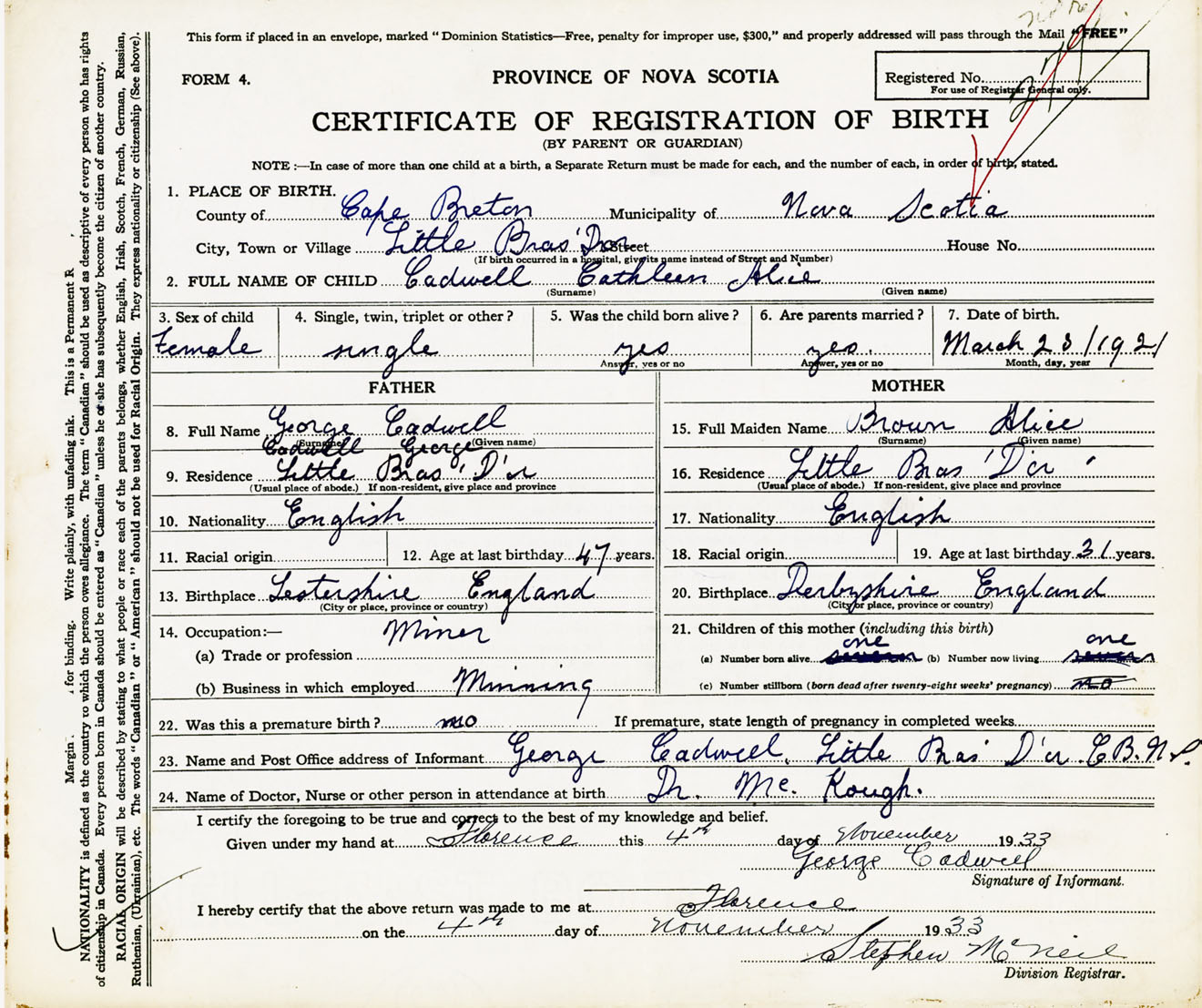 22. Name of Doctor, nurse or other person in attendance at birth Dr. McKough