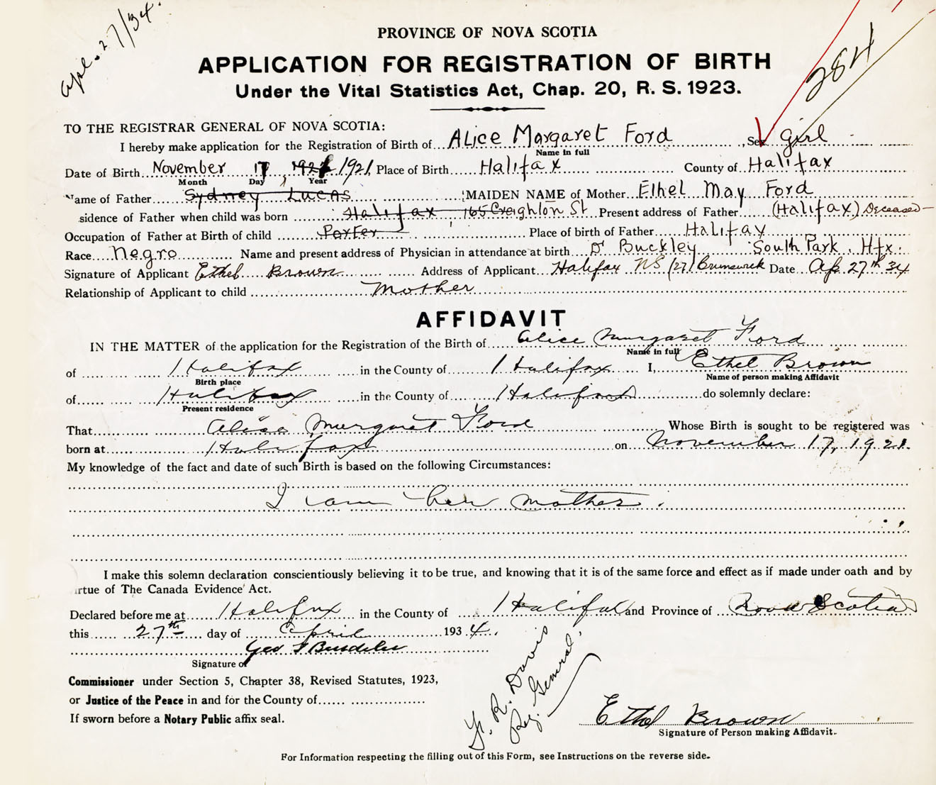 Signature of Applicant Ethel Brown Address of Applicant 271 Brunswick Street, Halifax, NS Date 27 April 1934