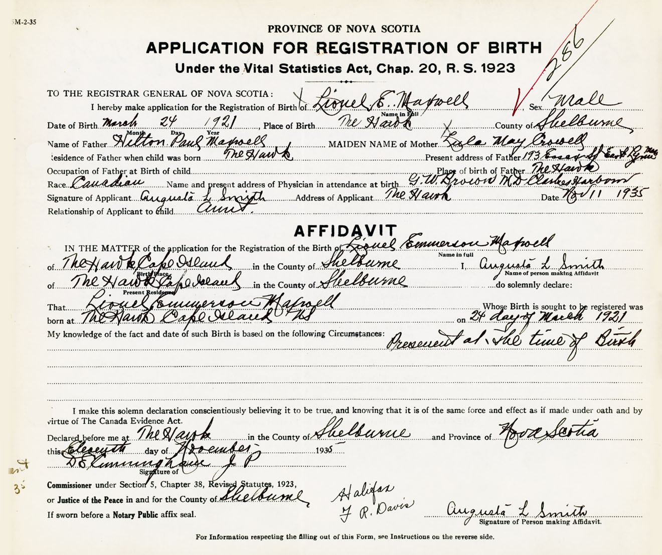 Signature of Applicant Augusta L. Smith Address of Applicant The Hawk, Shelburne Co., NS Date 11 November 1935