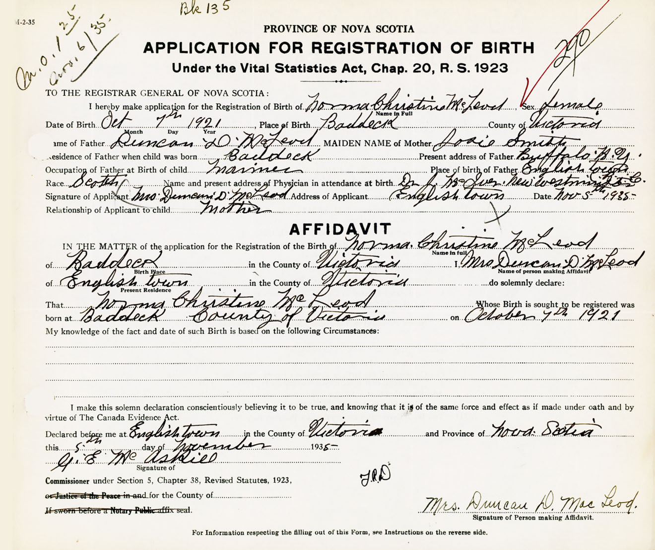 Signature of Applicant Mrs. Duncan D. McLeod Address of Applicant Englishtown, Victoria Co., NS Date 5 November 1935