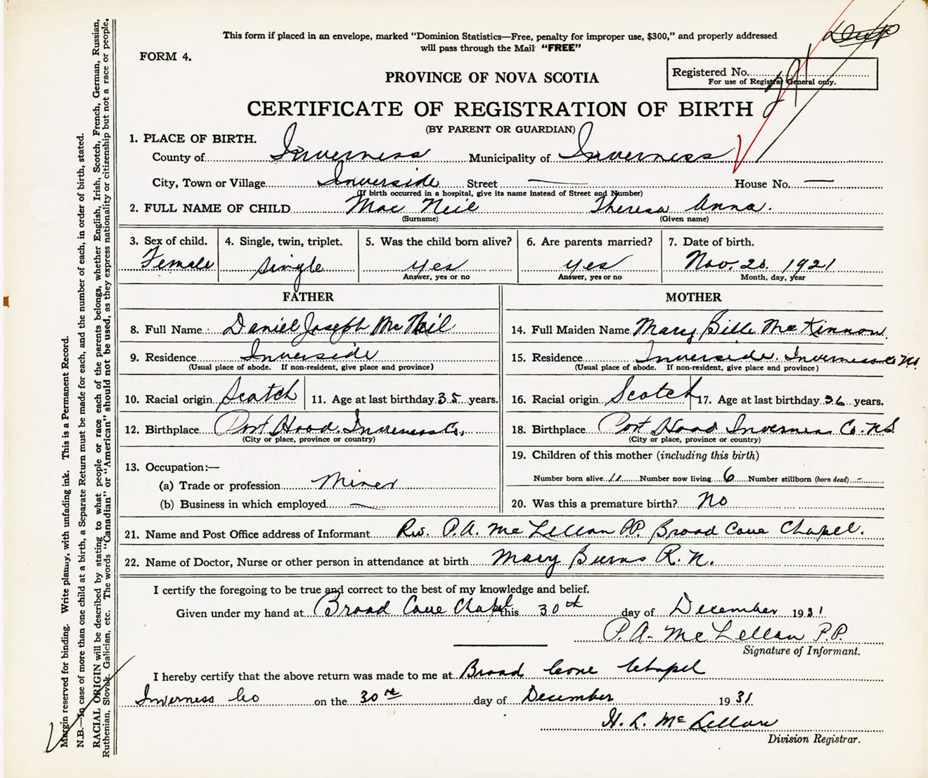 21. Name and Post Office address of Informant Rev. P. A. McLellan, Parish Priest Broad Cove Chapel, Inverness Co., NS
