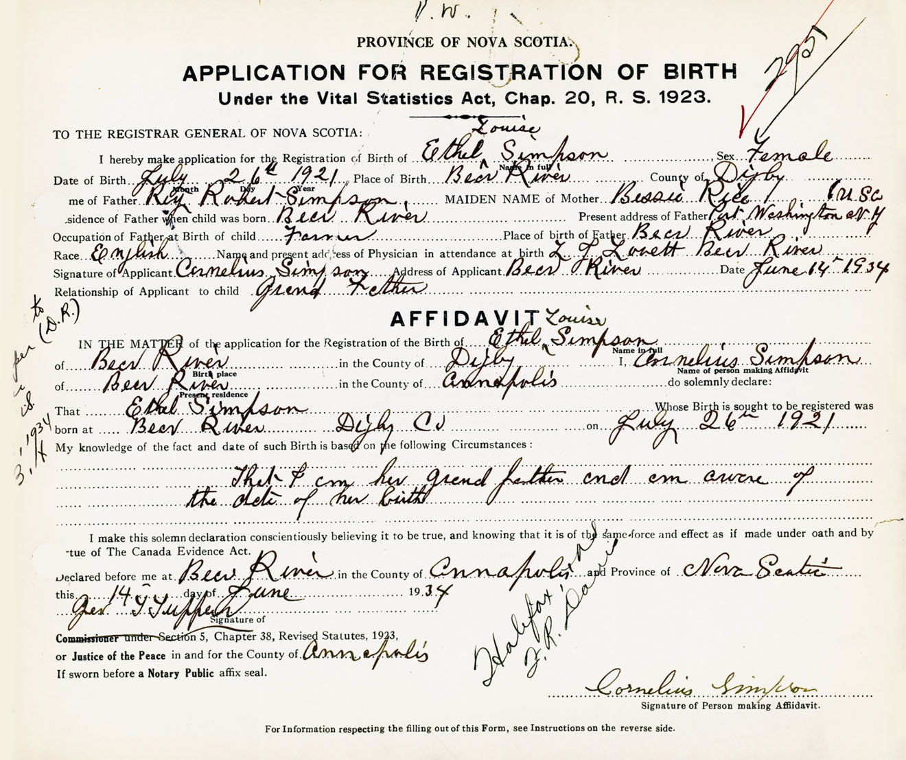Signature of Applicant Cornelius Simpson Address of Applicant Bear River, Digby Co., NS Date 14 June 1934
