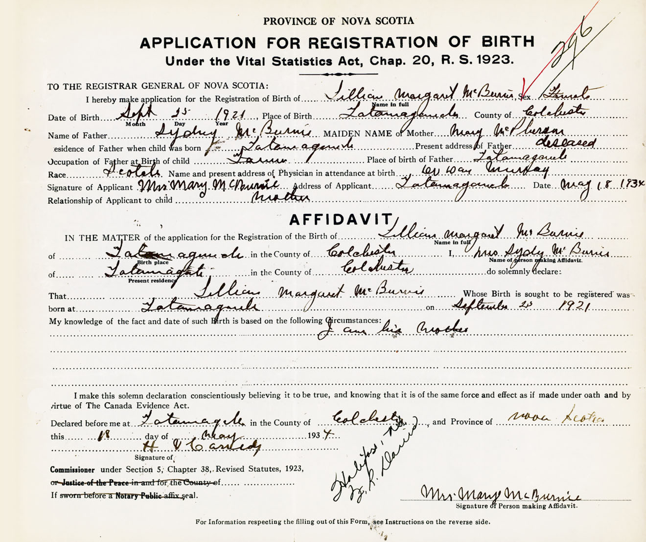 Signature of Applicant Mrs. Mary McBurnie Address of Applicant Tatamagouche, Colchester Co., NS Date 18 May 1934