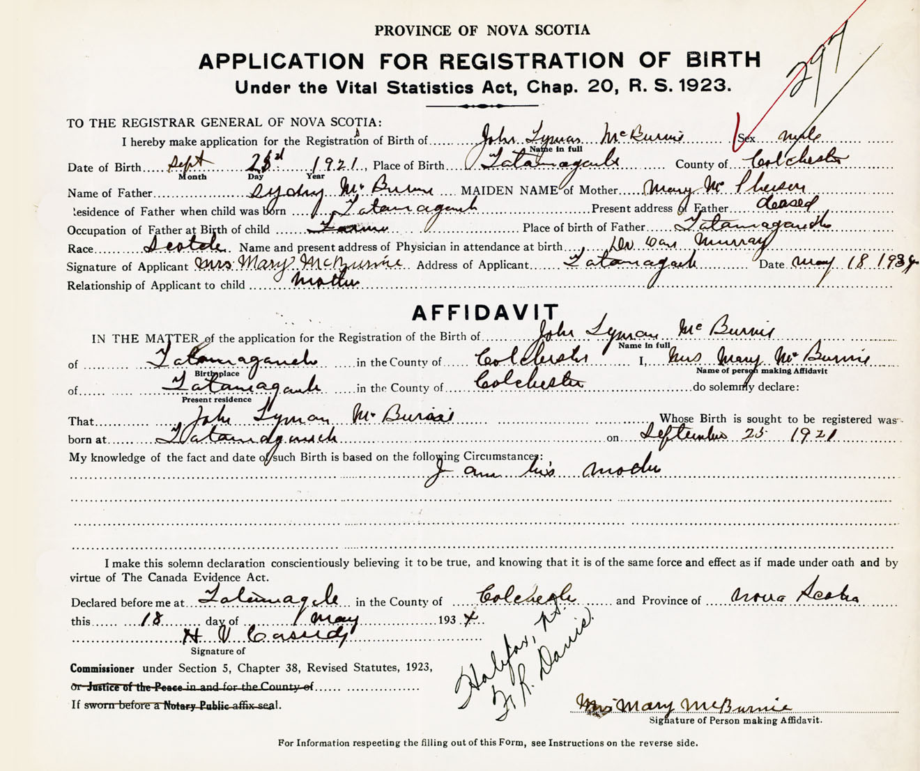 Signature of Applicant Mrs. Mary McBurnie Address of Applicant Tatamagouche, Colchester Co., NS Date 18 August 1934