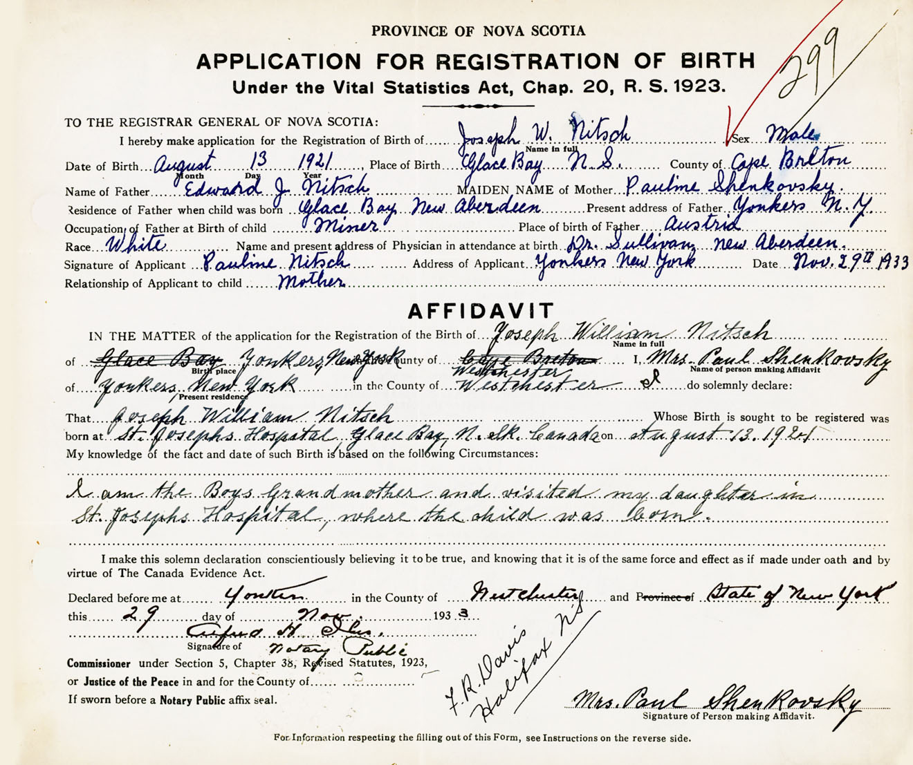 I hereby make application for the Registration of Birth of Joseph W.Nitsch Sex Male