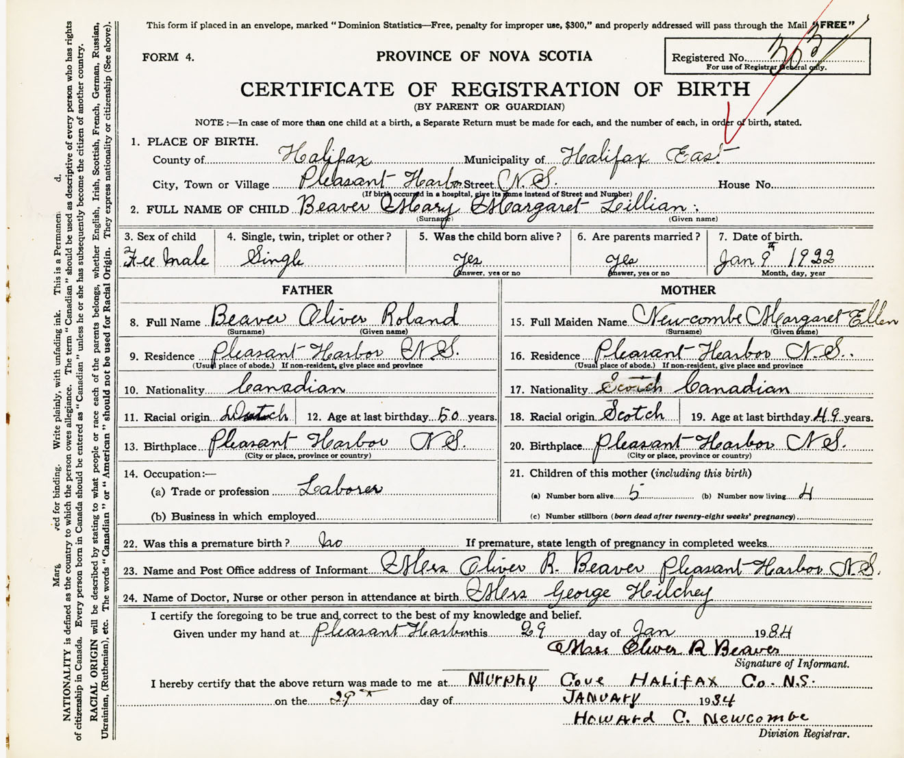 21. Name and Post Office address of Informant Mrs. Oliver R. Beaver Pleasant Harbour, Halifax Co., NS
