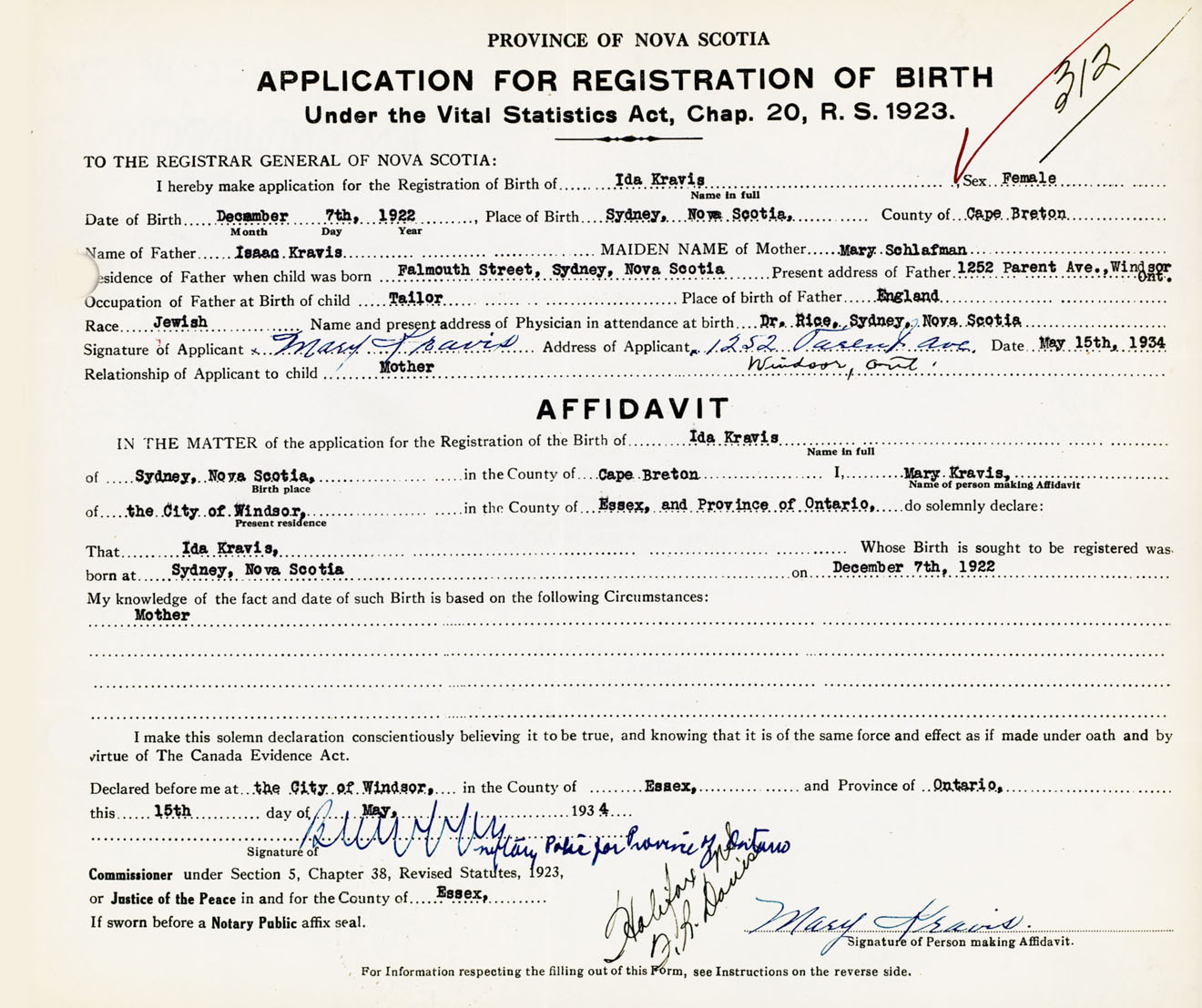 Signature of Applicant Mary Kravis Address of Applicant 1252 Parent Avenue, Windsor, Ontario Date 15 May 1934