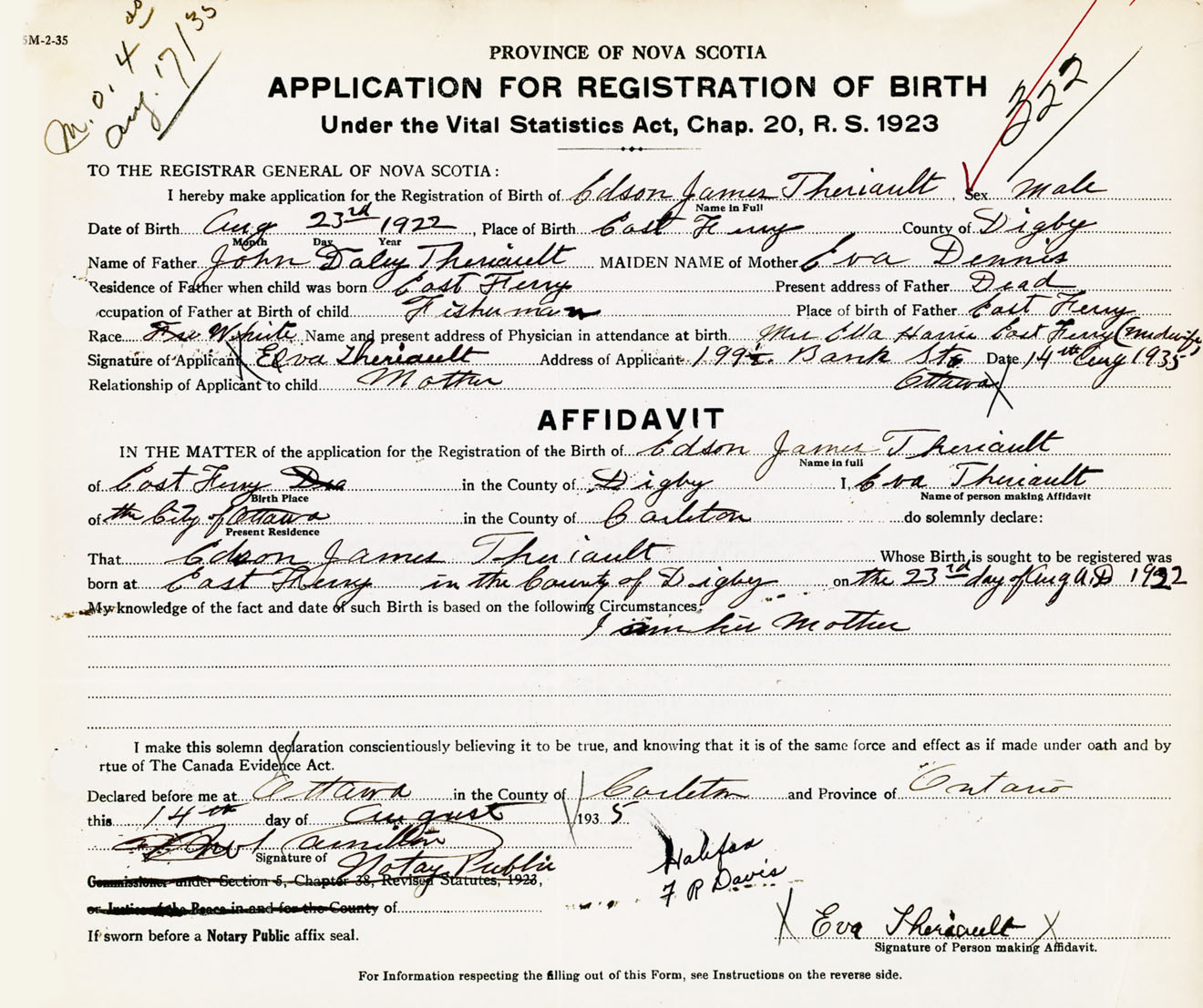 Signature of Applicant Eva Theriault Address of Applicant 199 1/2 Bank Street, Ottawa, Ontario Date 14 August 1935