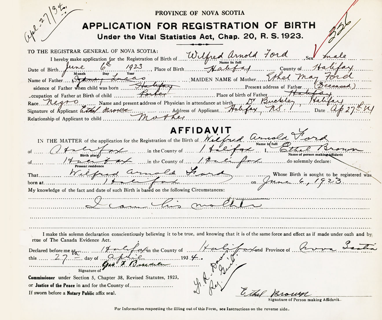 Signature of Applicant Ethel Brown Address of Applicant Halifax, NS Date 27 April 1934