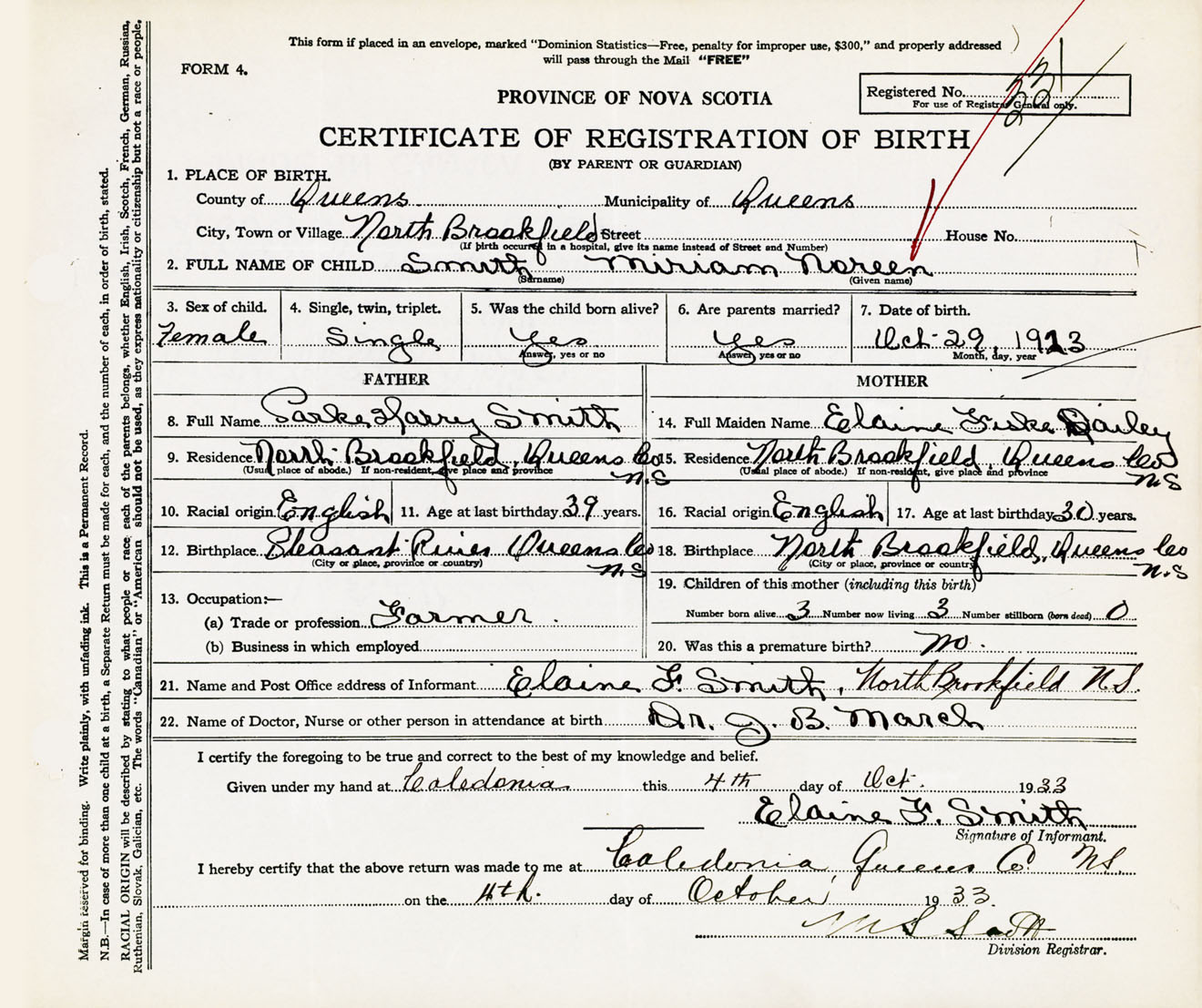 21. Name and Post Office address of Informant Elaine F. Smith North Brookfield, Queens Co., NS