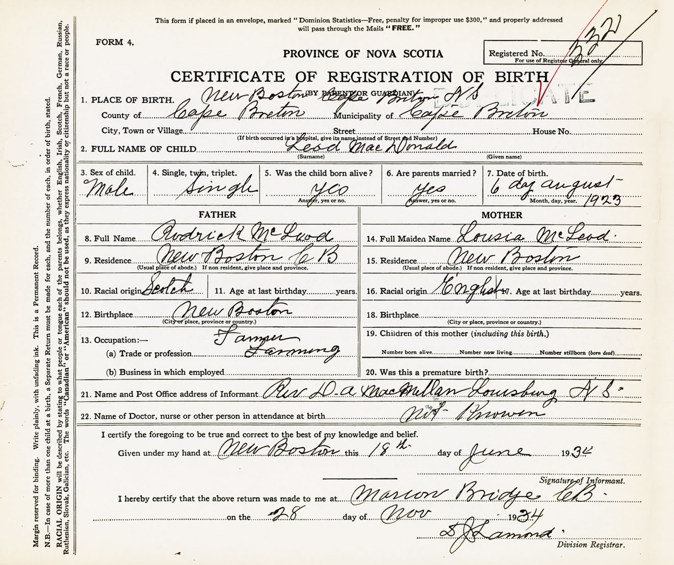 21. Name and Post Office address of Informant Rev. D. A. MacMillan Louisbourg, Cape Breton Co., NS