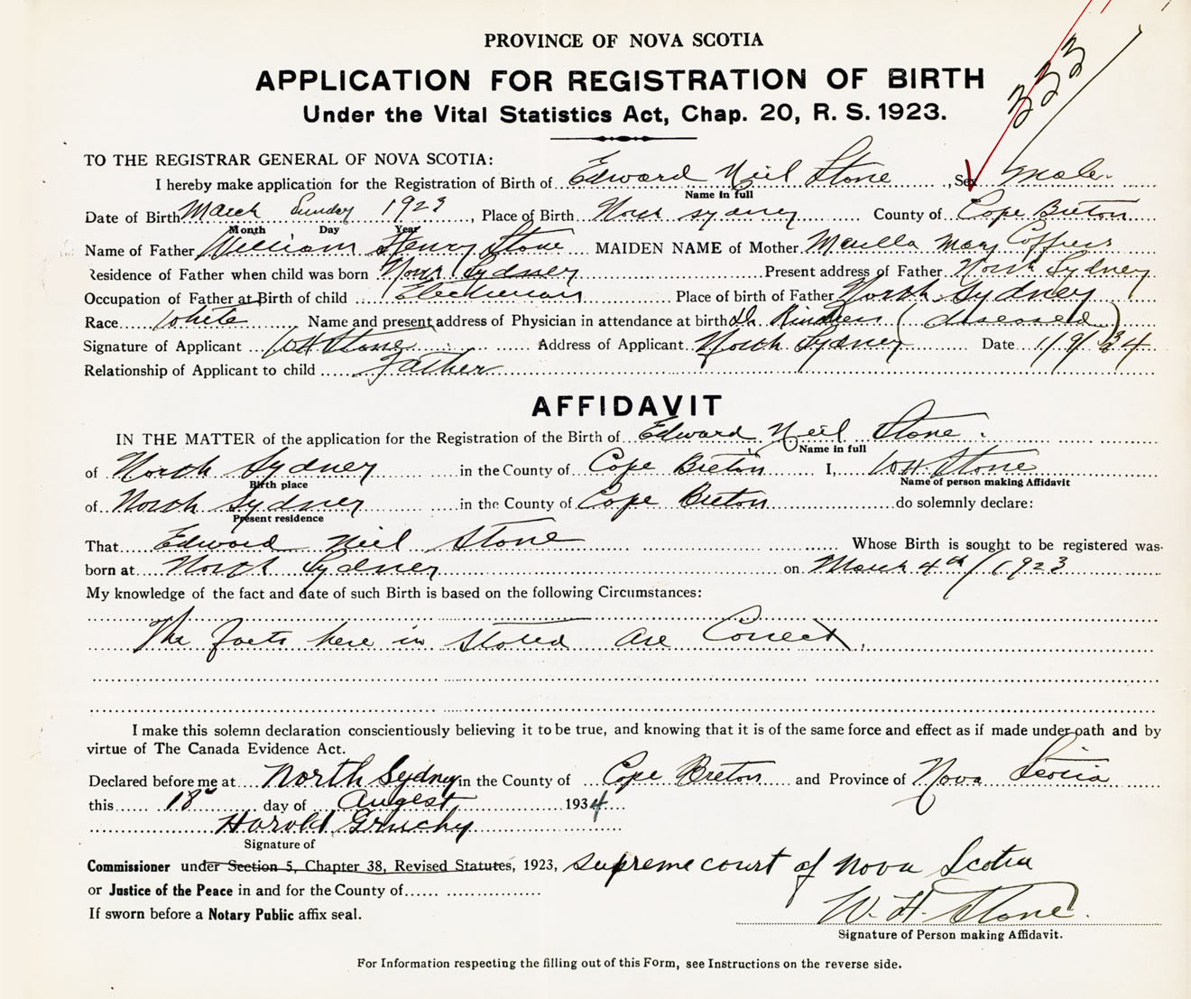 I hereby make application for the Registration of Birth of Edward NeilStone Sex Male