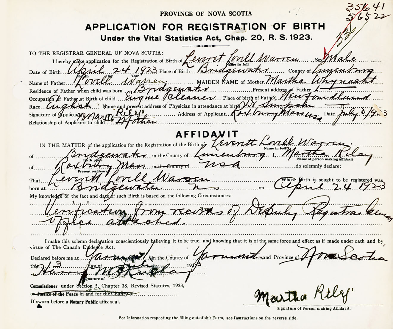 Date of Birth April 24, 1923 Place of Birth BridgewaterCounty of Lunenburg