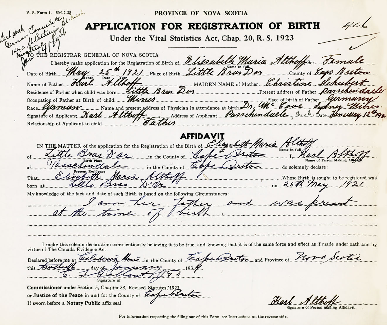 Signature of Applicant Karl Althoff Address of Applicant Passchendaele, Cape Breton Co., NS Date 12 January 1934