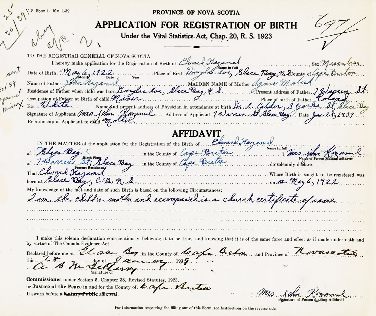 Date of Birth May 6, 1922 Place of Birth Douglas Avenue, Glace BayCounty of Cape Breton